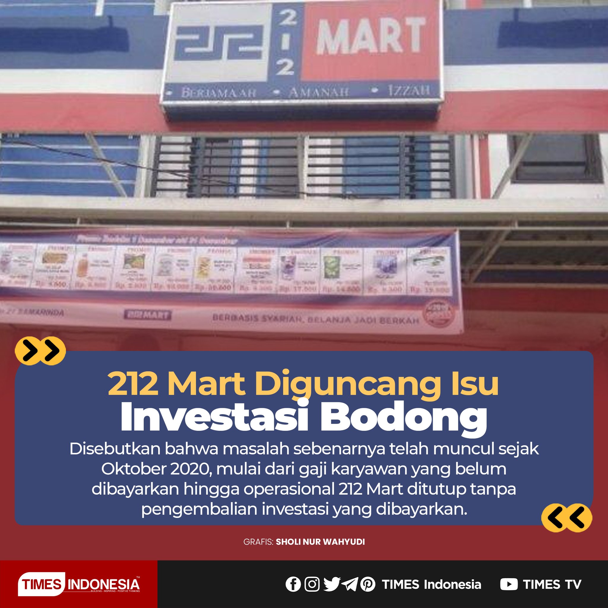 212 mart mengusung #spirit212, gerakan kebangkitan umat yang dipicu oleh perjuangan umat pada aksi bela islam (abi) ketiga yang fenomenal pada 2 desember 2016. Setelah menerima laporan korban penipuan investasi 212 mart pada jumat lalu (30/4/2021), polisi mulai. Namun kini ketiga toko tersebut sudah tutup, bahkan gaji karyawan yang bekerja di sana pun ditunggak. Salah satu korban penipuan investasi 212 mart mengaku awalnya mendapat informasi dari grup whatsapp untuk bergabung sebagai investor toko. Mereka ikut melakukan investasi dengan jumlah beragam, mulai dari rp500.000 sampai dengan rp20 juta rupiah.